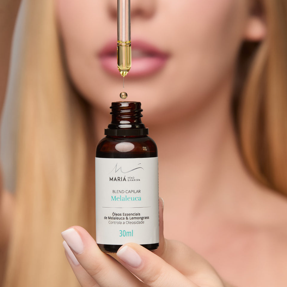Uso do Blend Melaleuca Oil Control 1 vez por semana antes de lavar os cabelos – atuação sinérgica de óleos essenciais específicos para equilíbrio da oleosidade.